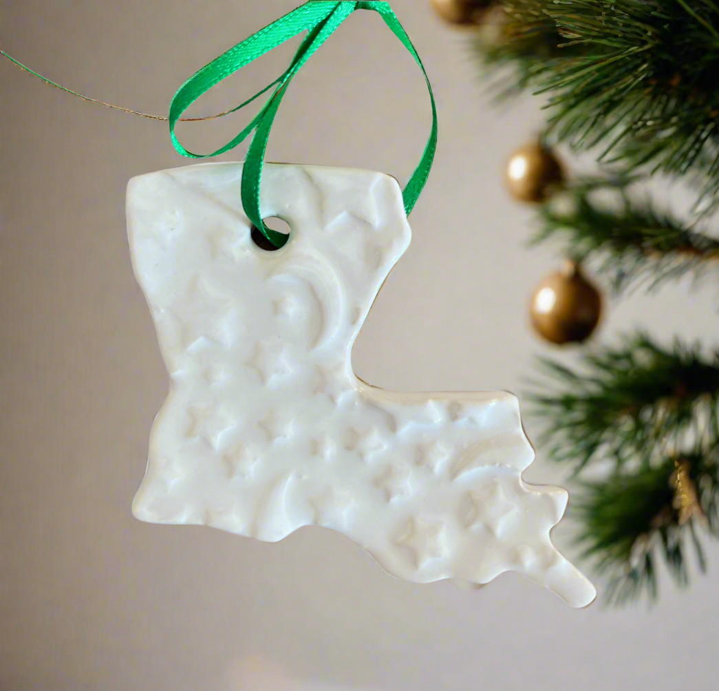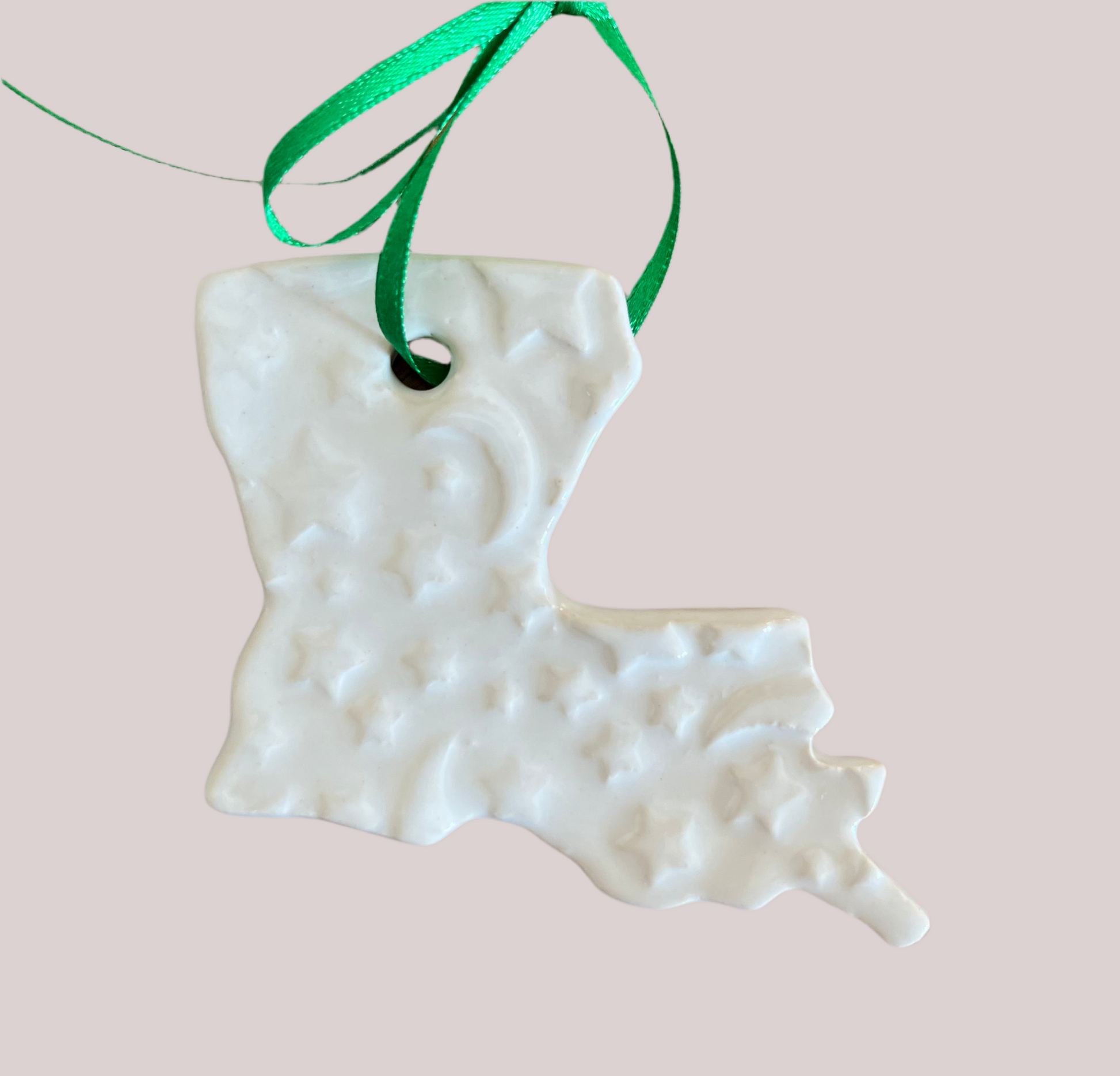 The Louisiana Ornament is an expertly crafted stoneware ornament, featuring the iconic stars and moon design. Durable and charming, it makes for a perfect gift or addition to any holiday tree.