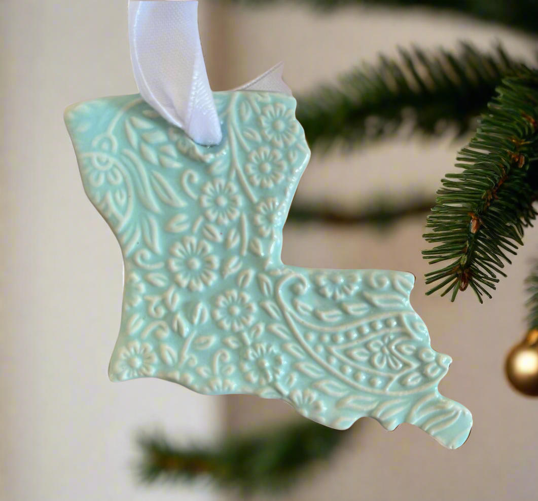 Add a touch of Louisiana charm to your holiday décor with our Turquoise Louisiana Ornament. Made from durable stoneware, this ornament is both a perfect gift and a keepsake for years to come. Bring a piece of the Bayou to your tree this holiday season.