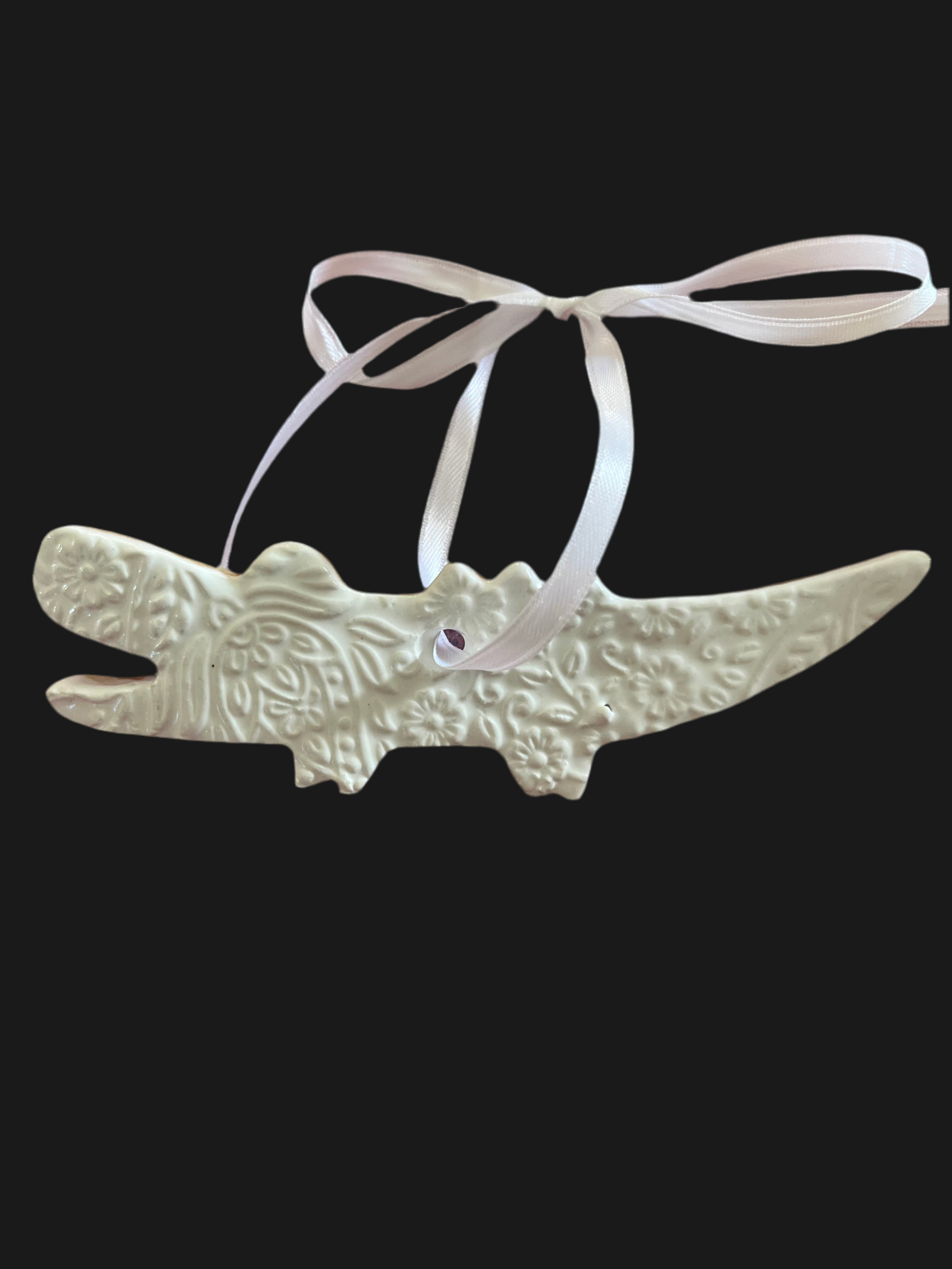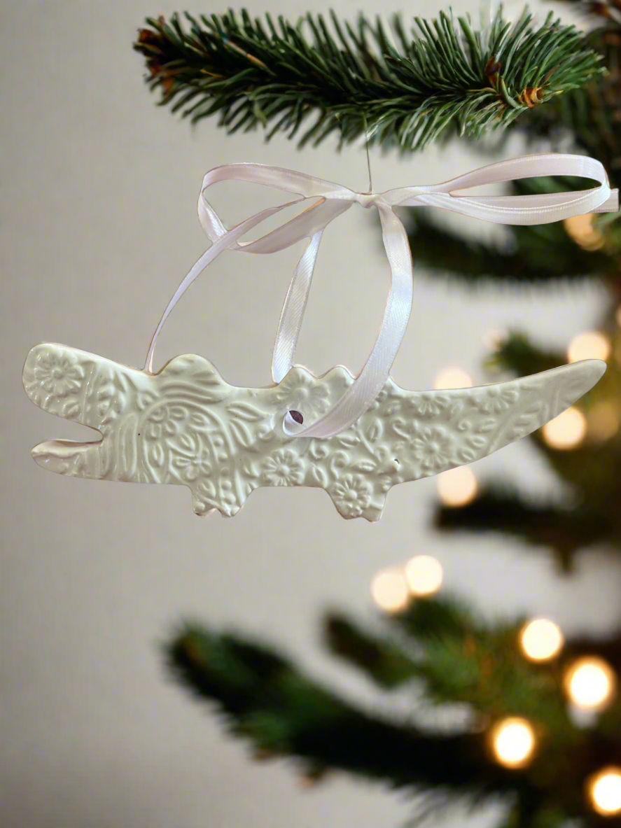 Add a touch of luxury to your holiday decor with our white alligator ornament. Made from durable stoneware clay, this ornament is perfect for gifting or adding an elegant touch to your tree. Embrace the unique beauty of an alligator in a stylish and festive way.